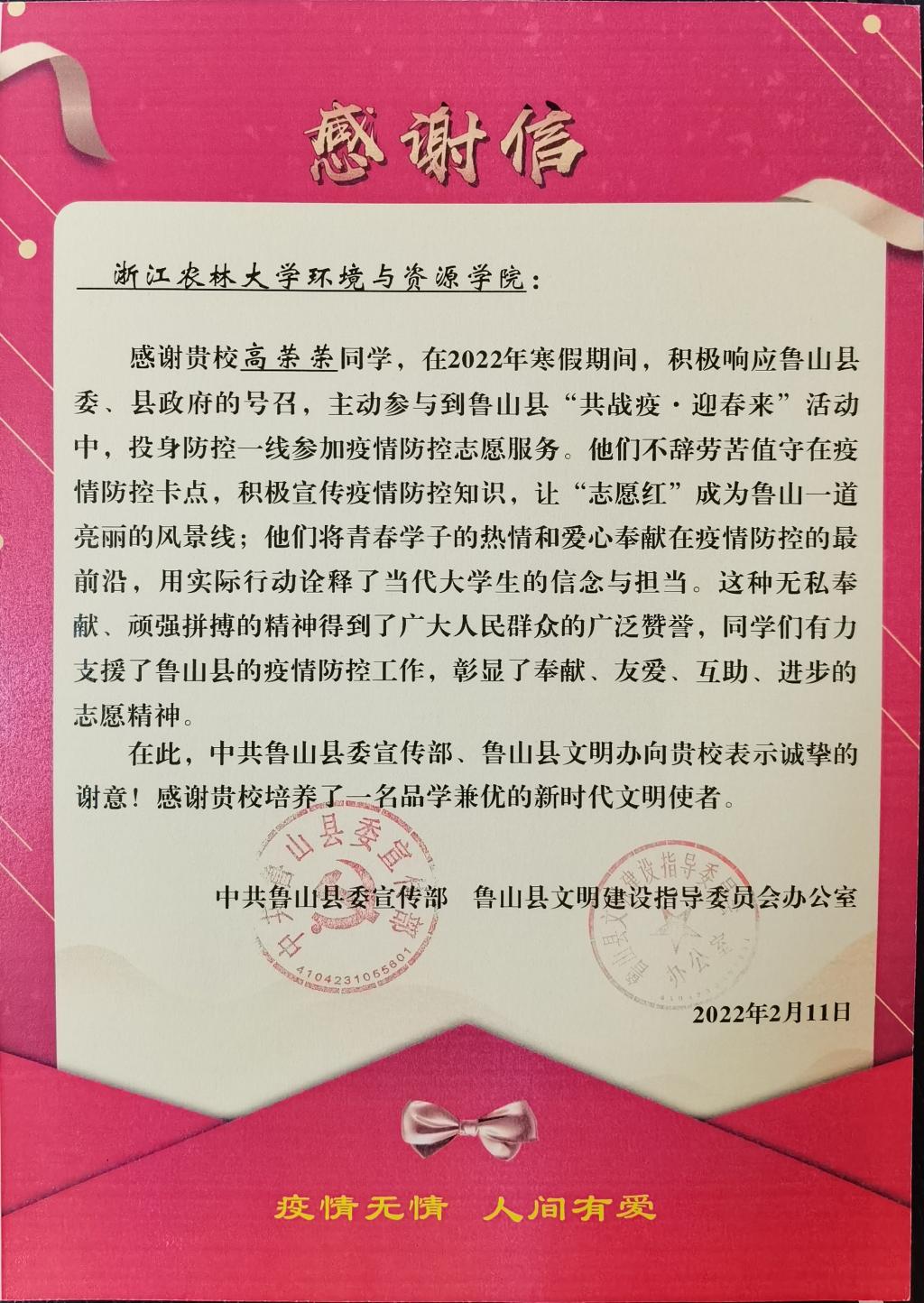 這封感謝信不僅承載著對高榮榮同學參與抗疫宣傳工作的感謝,更是對新時代農林學子精神風貌的高度肯定。