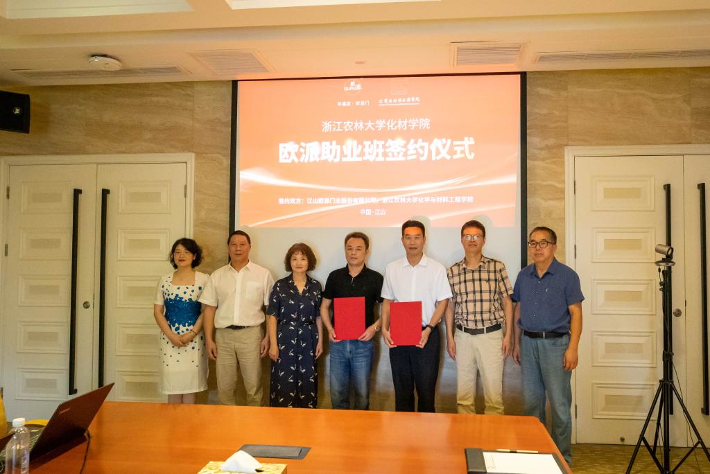 經過前期充分洽談,當天上午,化材學院與江山歐派門業股份有限公司簽署了合作協議,成立“歐派助業班”。簽約儀式上,江山歐派門業股份有限公司董事長吳水根表示,“歐派助業班”的設立是校企戰略合作的良好開端,雙方將進一步拓寬合作領域,落實落細各項內容,全力推動項目落地。
