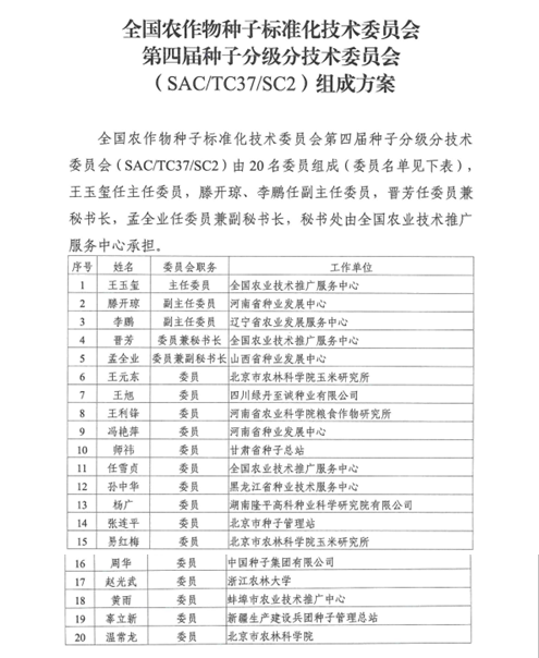 據悉,全國農作物種子標準化技術委員會第四屆種子分級分技術委員會由20名委員組成,主任委員為全國農業技術推廣服務中心王玉璽研究員,秘書處設在全國農業技術推廣服務中心。我校是唯一入選的高校單位。
