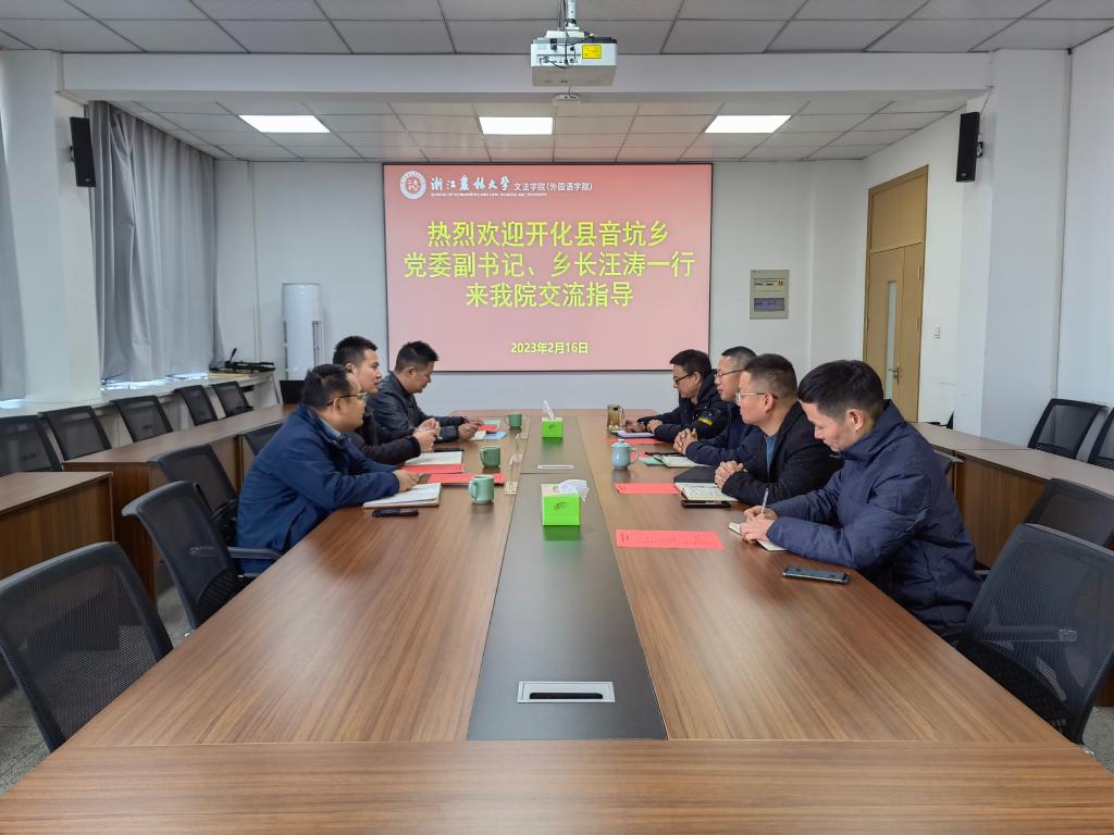 2月16日,開化縣音坑鄉(xiāng)黨委副書記、鄉(xiāng)長汪濤一行來訪文法學(xué)院,就院地合作事宜進(jìn)行深入洽談,院長魯可榮等學(xué)院領(lǐng)導(dǎo)出席并參加座談。