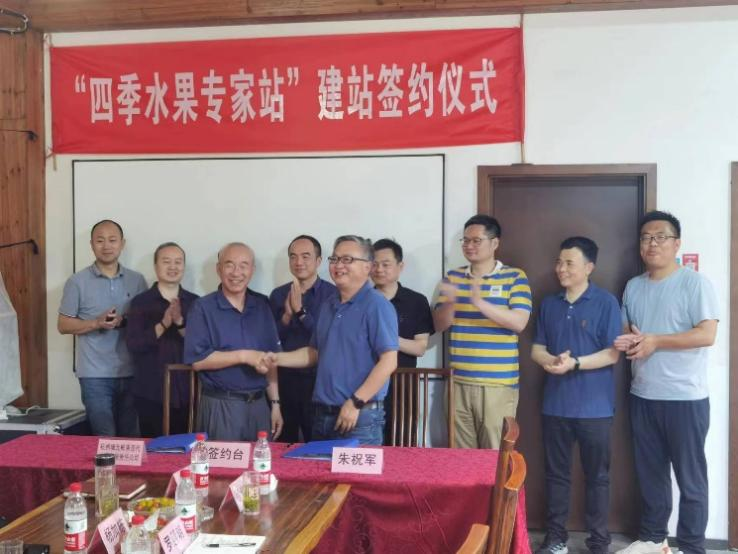 在大家的見證下,朱祝軍與王以文代表雙方簽約共建“四季水果專家站”。