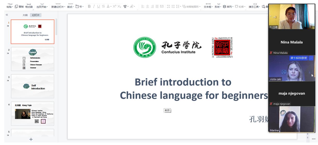 根據報名學生的不同漢語水平,授課教師將課程設置為零起點班和HSK2級班進行教學。本期課程將持續15周,由教育部語合中心派出的諾大孔院漢語教師進行授課。當前塞爾維亞的疫情形式仍然不容樂觀,根據當地防疫政策,中文課程采用線上形式安排在周末時間進行。